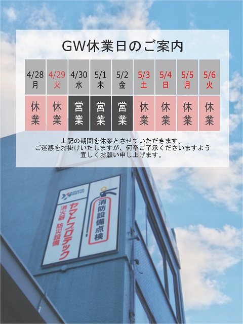 ゴールデンウィーク中の休業日のご案内です。 4月26日(土)〜4月29日(火) 及び 5月3日(土)〜5月6日(火) を休業とさせていただきます。