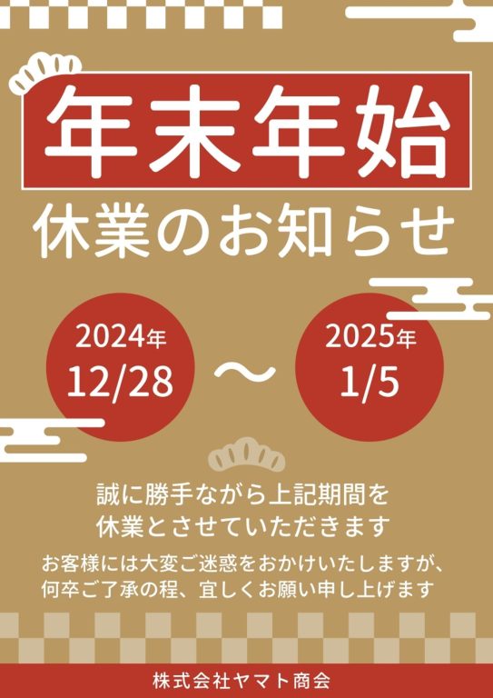平素は格別のお引立てを賜わり厚く御礼申し上げます。 今後共一層の御指導と御鞭撻の程、宜しくお願い申し上げます。 なお、弊社の年末・年始の休みを下記の通りとさせて頂きます。