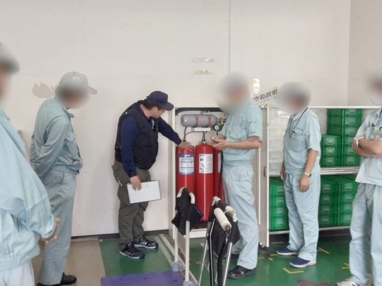 その際に従業員の方たちにパッケージ型消火設備についての説明と消火器の訓練をさせていただきました。