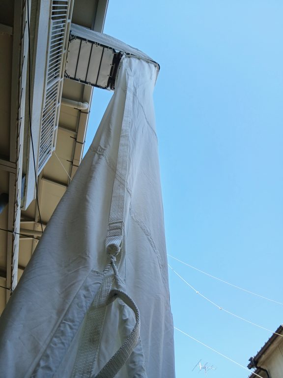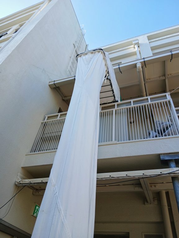 こちらに設置されている救助袋は垂直式救助袋で、筒状の袋の中をすべり降りて地上に避難する、避難器具の一つです。