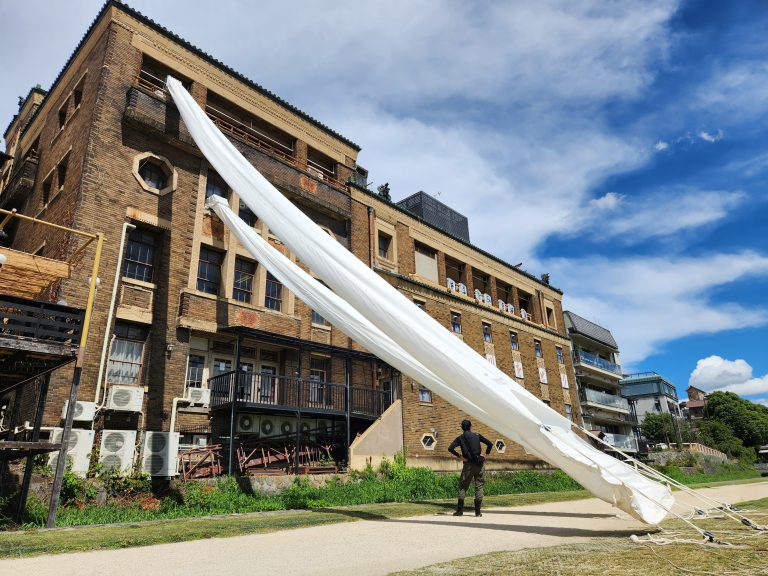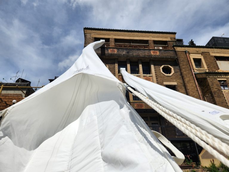 こちらに設置されている避難器具は建物から斜めに筒状の袋の中を降下避難する「斜降式救助袋」です。