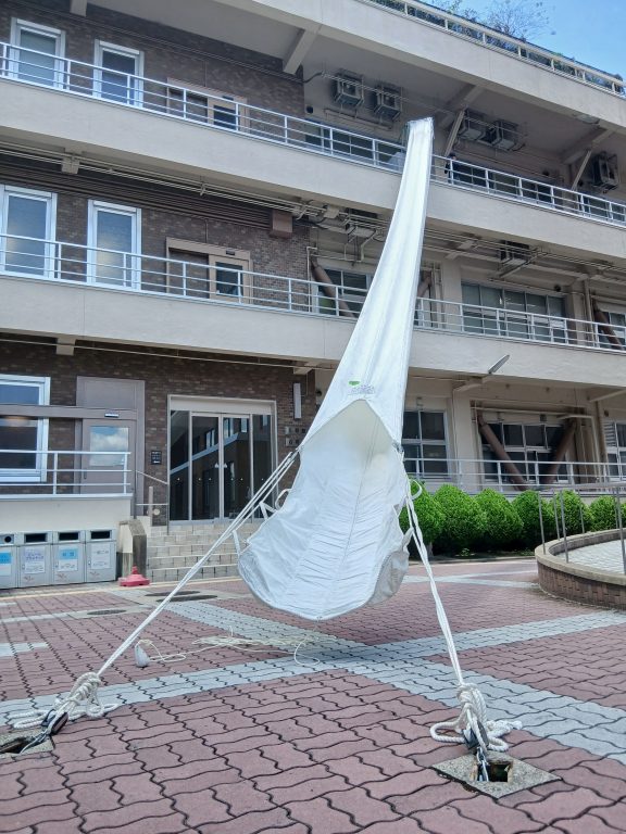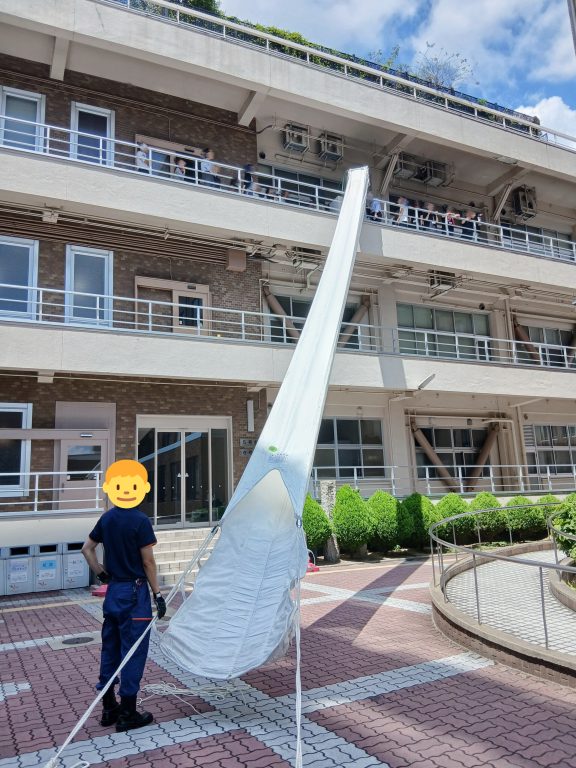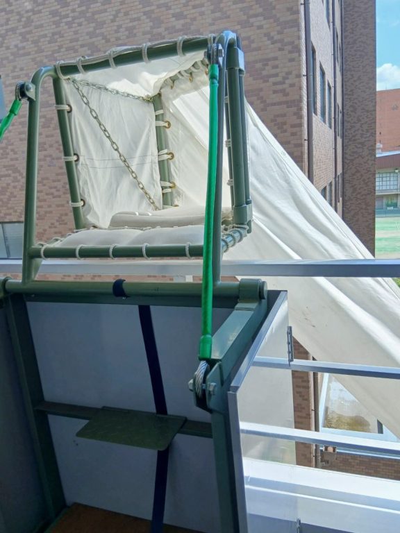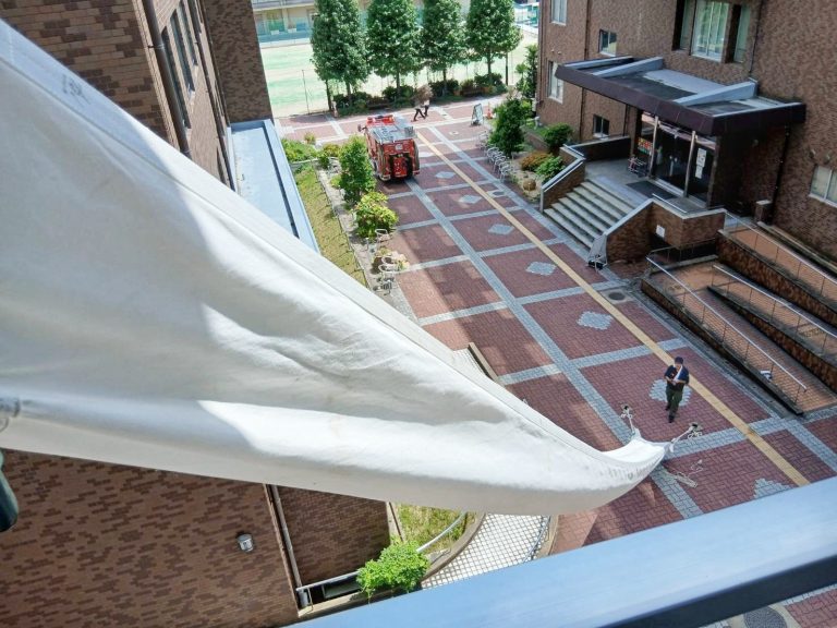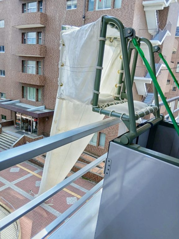 まずは器具が格納されている箱の中から救助袋などを地上へ向かって降ろします。
